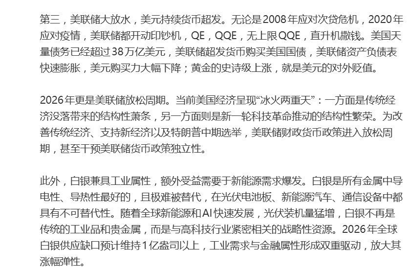 此外,白银兼具工业属性,额外受益需要于新能源需求爆发。白银是所有金属中导电性、导热性最好的,且极难被替代,在光伏电池板、新能源汽车、通信设备中都具有不可替代性。随着全球新能源和AI快速发展,光伏装机量猛增,白银不再是传统的工业品和贵金属,而是与高科技行业紧密相关的战略性资源。2026年全球白银供应缺口预计维持1亿盎司以上,工业需求与金融属性形成双重驱动,放大其涨幅弹性。